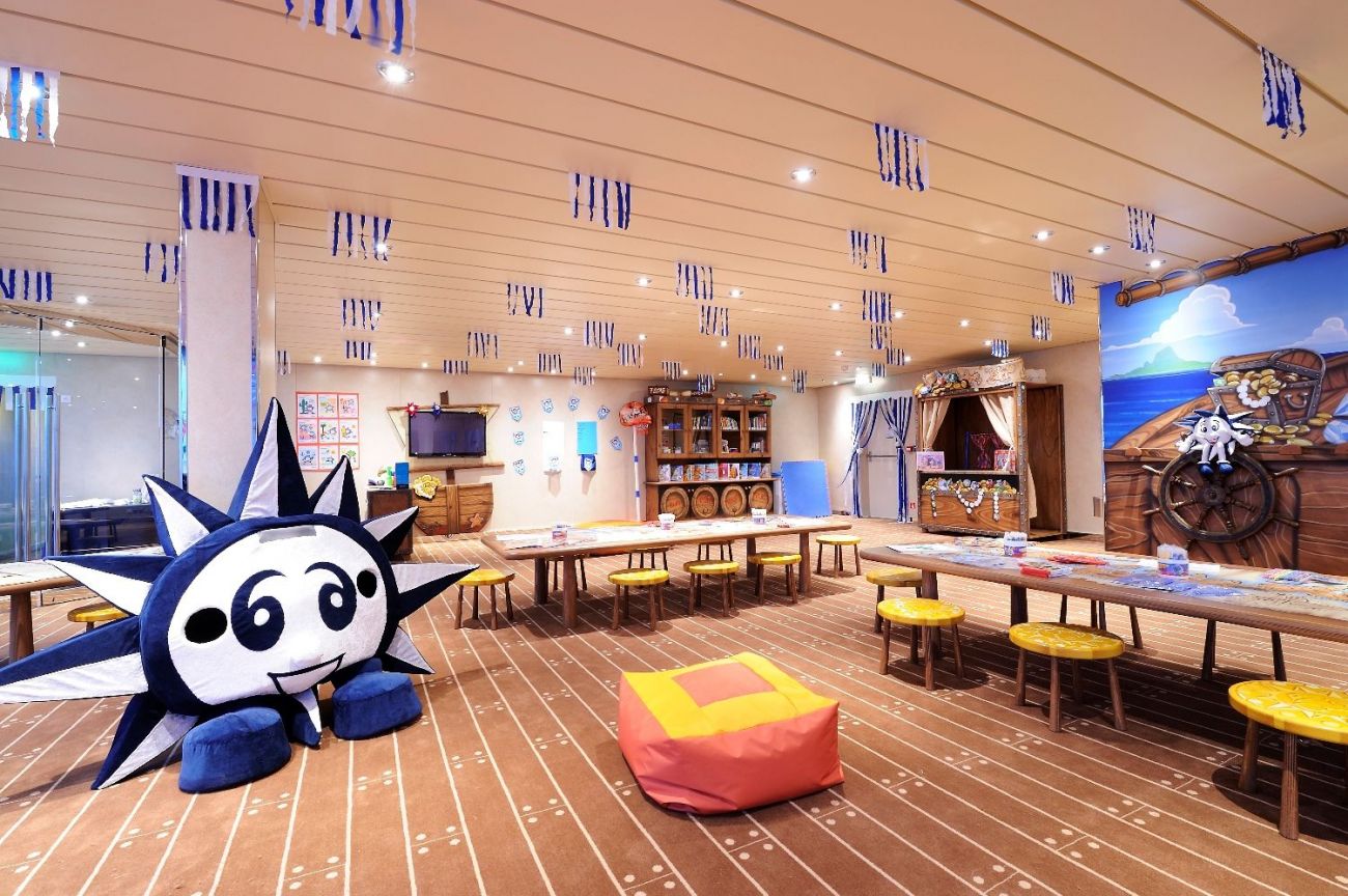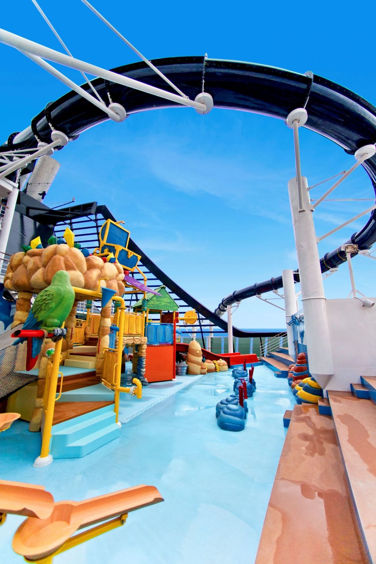4 басейна, 12 джакузи, 120 метрова водна пързалка, плажна зона с шезлонги на откритата палуба.