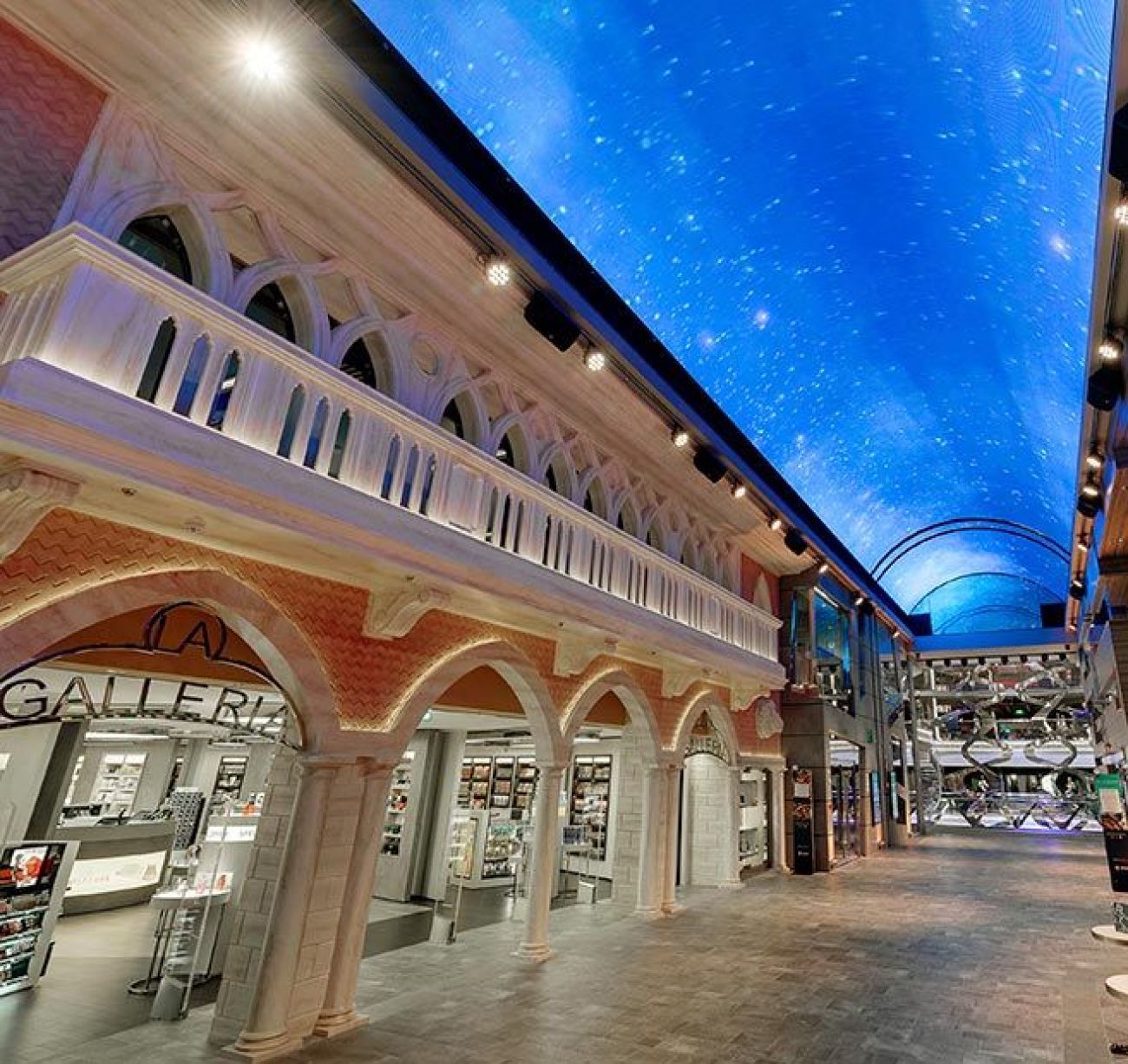 Класическата вече за корабите от флотилията вътрешна променада с LED таван, обградена от ресторанти и магазини, отново се превръща в център на социалния живот на борда, както и в сцена на различни партита и събития.