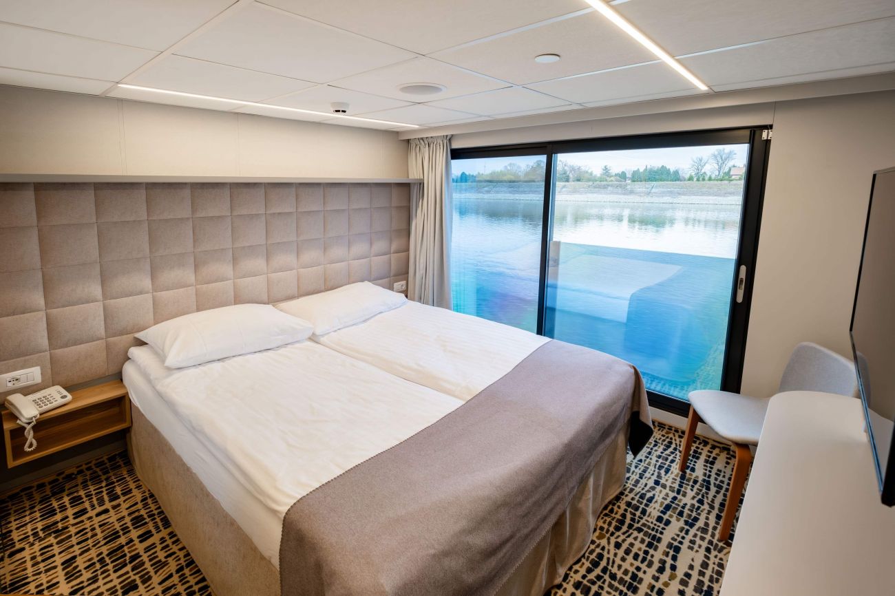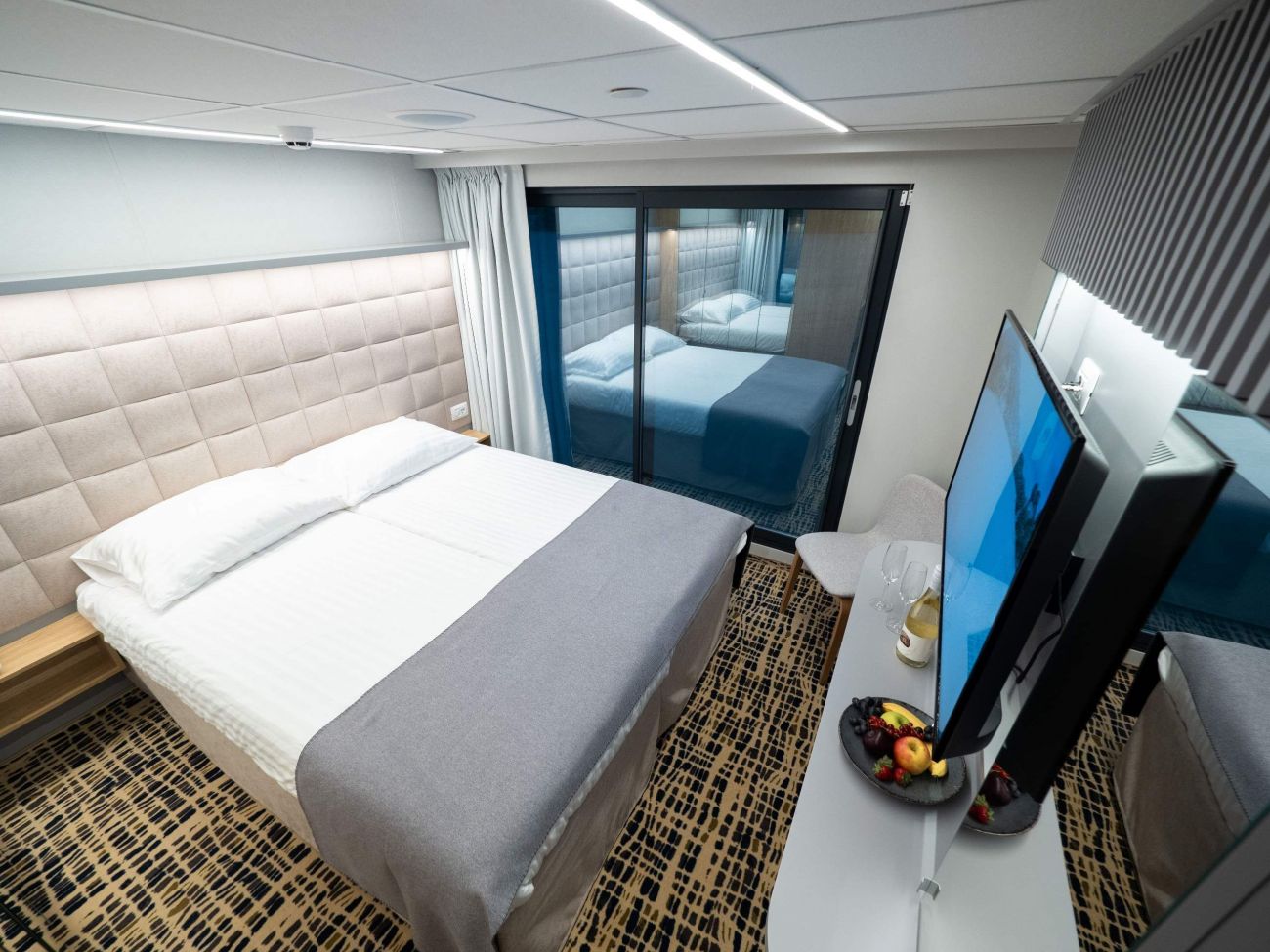 Каютите на средна и горна палуба са с площ от 14 м2 и големи френски отварящи се прозорци.