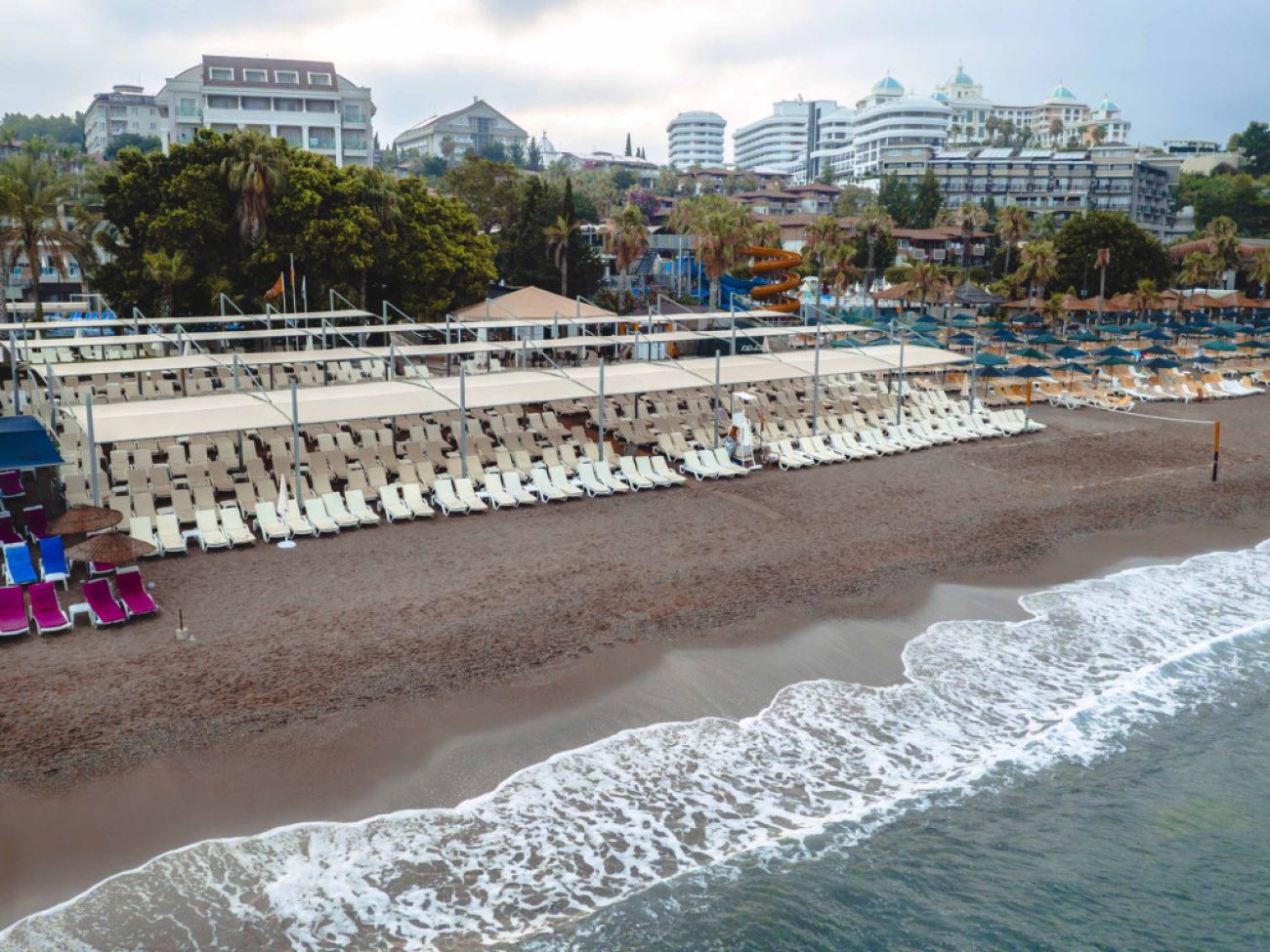 Собствен, пясъчно-чакълест, с дължина на плажната ивица 40м. Чадъри, шезлонги и плажни кърпи на плажа и при басейна – безплатно.