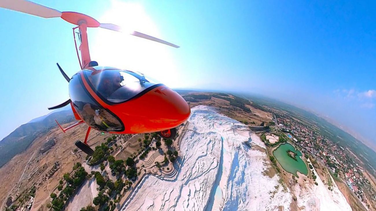Полет с жирокоптер над природния феномен Памуккале и древния град Хиераполис. Ще получите инструктаж от лицензиран пилот и ще летите заедно с него, наслаждавайки се на красотите на района от птичи поглед.