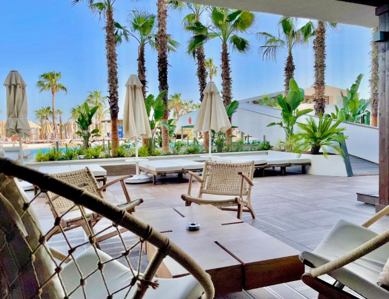 Собствен,, пясъчен сдължина 100 м. и платформа, на която е разположен Mocha Beach Club с кабани (срещу заплащане). Чадъри, шезлонги и плажни кърпи на плажа и при басейна -безплатно.