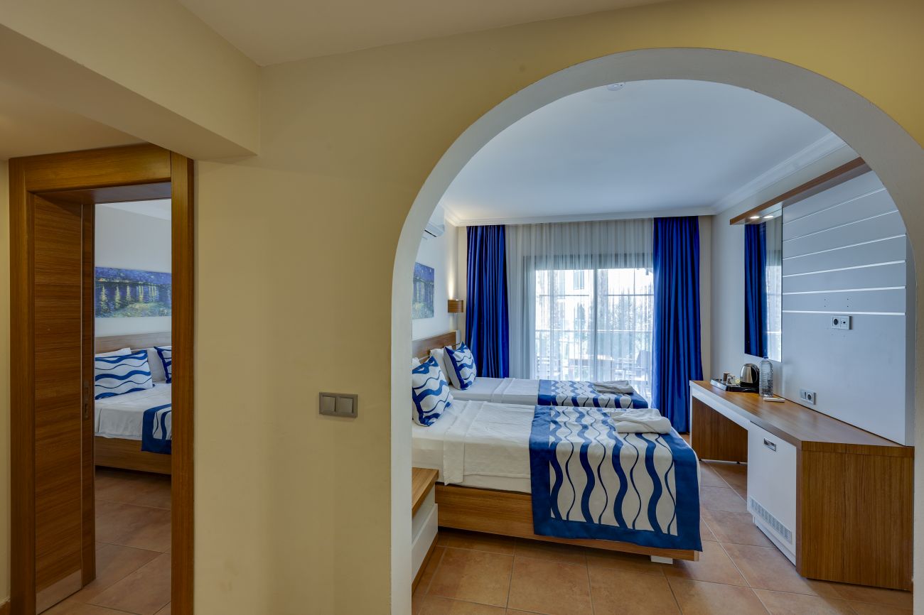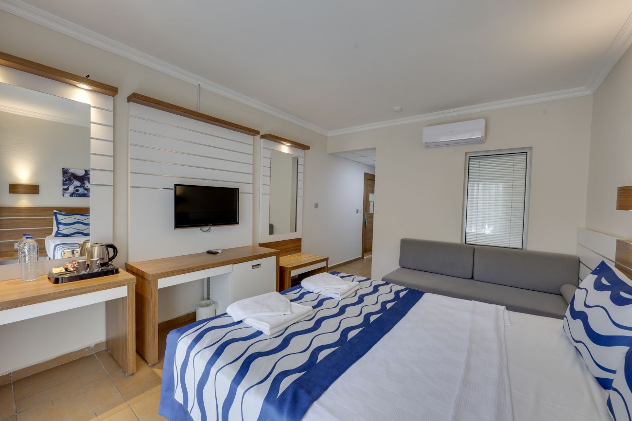 Хотелът разполага с общо 274 стаи, разположени в 3-етажни сгради, от които 33 Club room (нереновирани стаи - 26 м²),178 Hotel room (реновирани стаи, разположени в основен корпус или в триетажни сгради - 26 м²), 28 Club family room (нереновирани стаи, 2 спални, 1 баня - 45 м²) , 35 Family hotel room (реновирани стаи, 2 спални, 1 баня - 45 м²), Disabled Room (пригодени за хора с ограничена подвижност - 26 м²).
