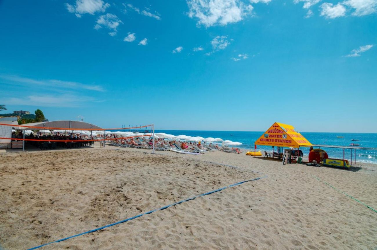 Собствен, пясъчно – чакълест на 150 м от хотела, чрез подлез. Чадъри, шезлонги и плажни кърпи на плажа и при басейна – безплатно.