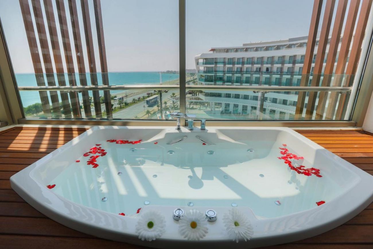 Стаи Main Building: 244 Hotel Standard sea view room (изглед море - 28 м2), Hotel Standard side sea view room (частичен изглед море - 28 м2), Hotel Standard land view room (изглед суша - 28 м2), 15 Dublex room (на 2 етажа - 2 спални, 2 бани, 1 диван - 56 м2), 7 Deluxe suite room (1 спалня, хол, 1 баня + джакузи - 57 м2), 4 Suite room (1 спалня + диван, 1 баня – 50 м2), 9 Large Standard room (32 м2).