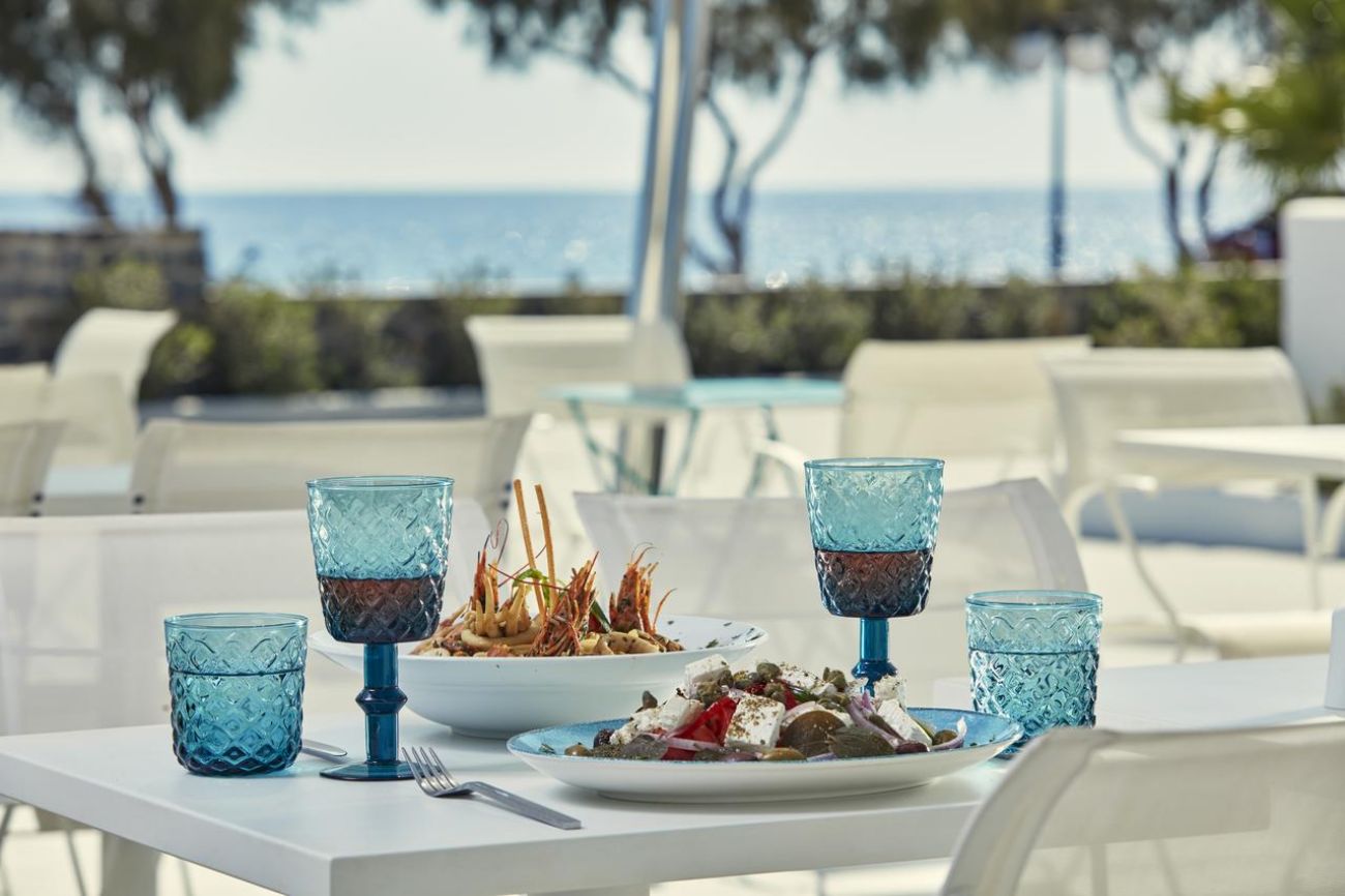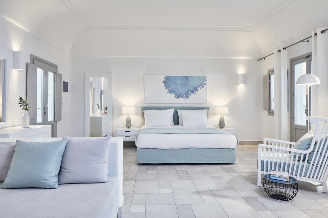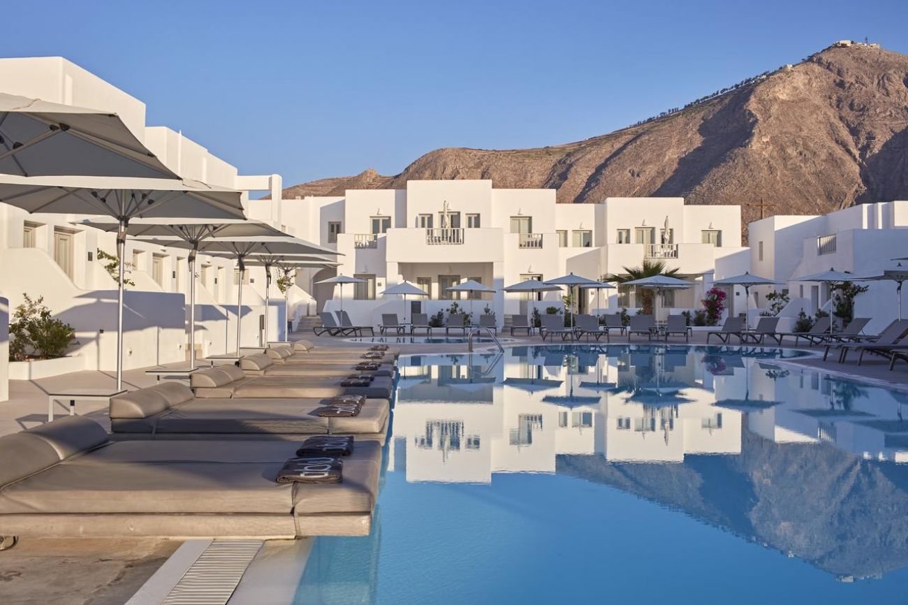 Aqua Blue Beach Hotel е разположен на плажа Периса и разполага с частен плаж с шезлонги и чадъри. Фира, оживената столица на Санторини, се намира на 15 км, а летище Санторини и пристанището са на 20 минути с автомобил. В близост до хотела има условия за водни спортове. Наблизо има и ресторанти, както и други възможности за развлечения.