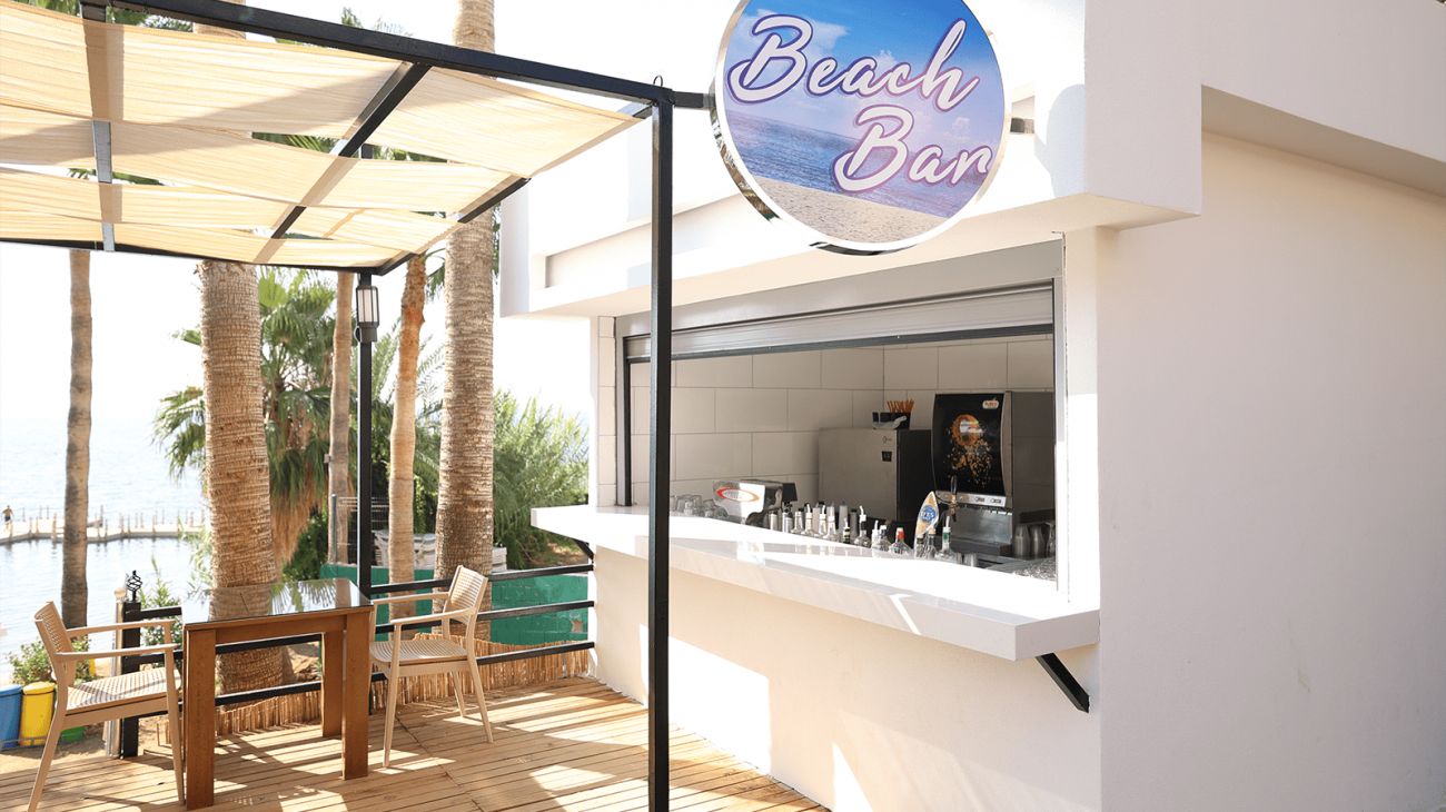 Собствен, пясъчно - чакълест. Чадъри, шезлонги и плажни кърпи на плажа и при басейна – безплатно.