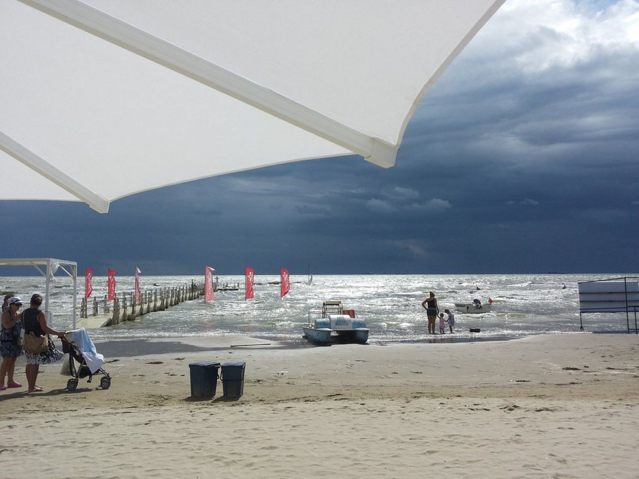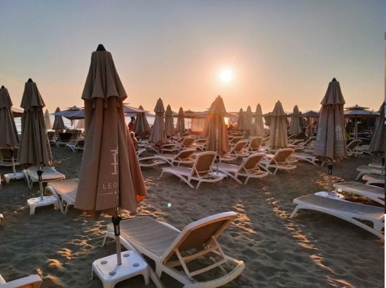 Собствен, пясъчен на 50 м. от хотела. Чадъри и шезлонги при басейна и на плажа - безплатно.