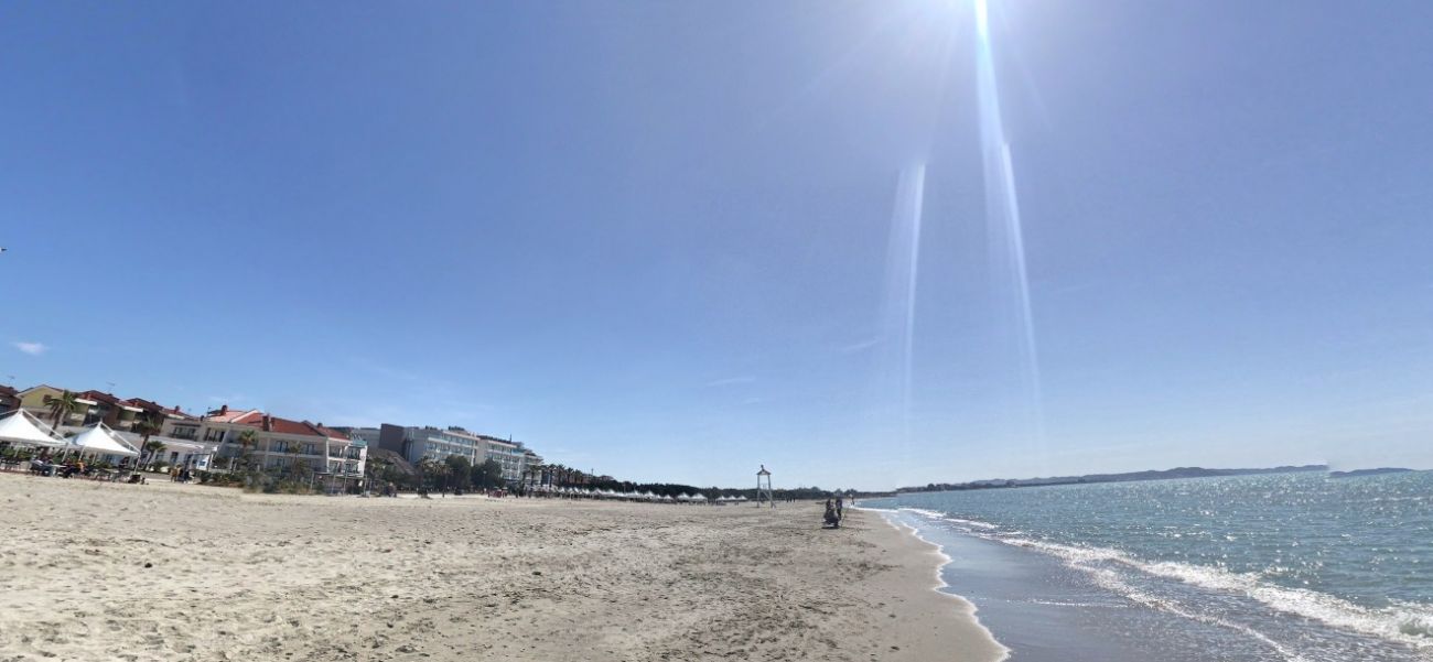 Градски пясъчен плаж. Чадъри и шезлонги на плажа - срещу заплащане.