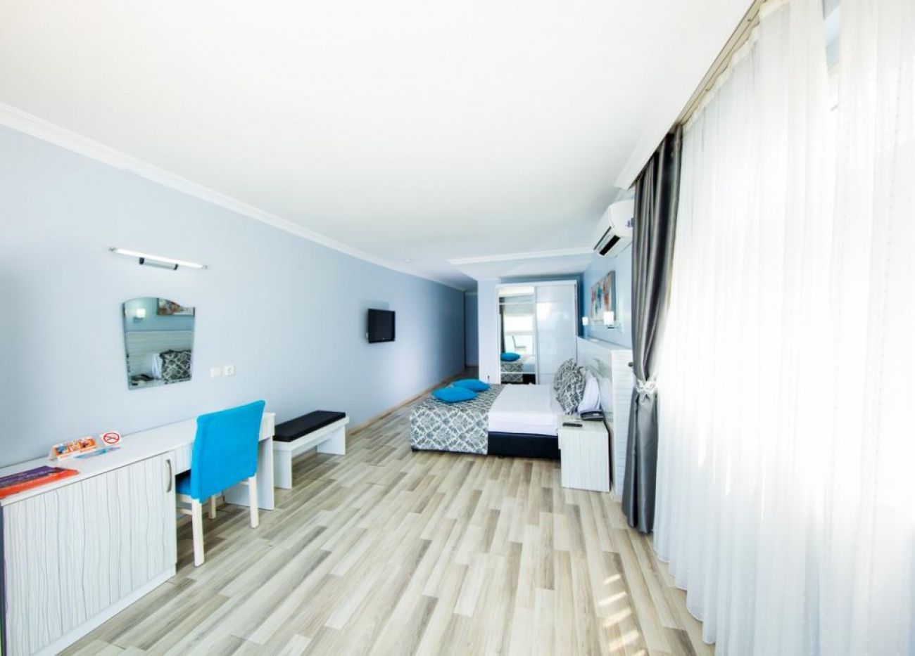 Разполага със 110 стаи, от които 106 стандартни (15-22 кв.м) и 4 фамилни (40 кв.м), 1 суит. Всички оборудвани с климатик, телевизор, баня с душ или вана, сешоар, минибар (платен), сет за чай/кафе, сейф (безплатен), балкон. По-голямата част от стаите имат невeроятна гледка към морето. Почистване на стаите - всеки ден. Смяна на спалното бельо и кърпите - 3 пъти в седмицата.