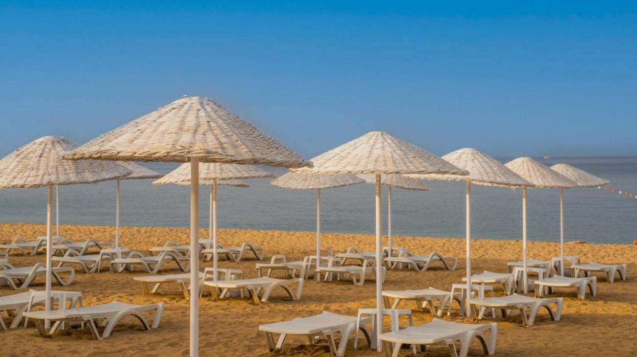Собствен, пясъчно - чакълест с дължина 650 м. Чадъри, шезлонги и плажни кърпи на плажа и при басейна – безплатно.