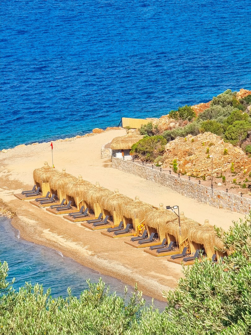 Собствен пясъчен плаж и платформа - чадъри, шезлонги, плажни кърпи и матраци на плажа и при басейна - безплатно.