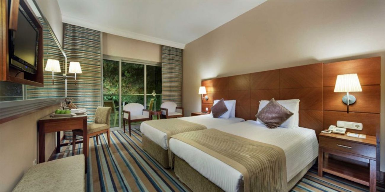 Хотелска част (девететажна сграда) с общо 320 стаи, от които: стандартни стаи с изглед градина (25 м²), с частичен изглед море (30 м²) и с изглед море (25 м²), супериор стаи с изглед море (40 м²), джуниър стаи с изглед градина (1 спалня - 31 м²), фамилни стаи с изглед градина (2 спални, 1 баня - 43 м²), стандарт суит (1 спалня, всекидневна, 1 баня - 50 м²), супериор суит (2 спални, всекидневна с кухненски бокс, 3 бани -119 м²), бизнес суит (1 спалня, всекидневна - 166 м²), стандарт суит с тераса (1 спалня, 1 баня, тераса с джакузи - 40 м²), стандарт суит с градина и тераса (1 спалня, всекидневна, 2 бани, градина с джакузи - 54 м²), супериор суит с басейн (2 спални, всекидневна, 2 бани, тераса с джакузи и басейн - 147 м²),