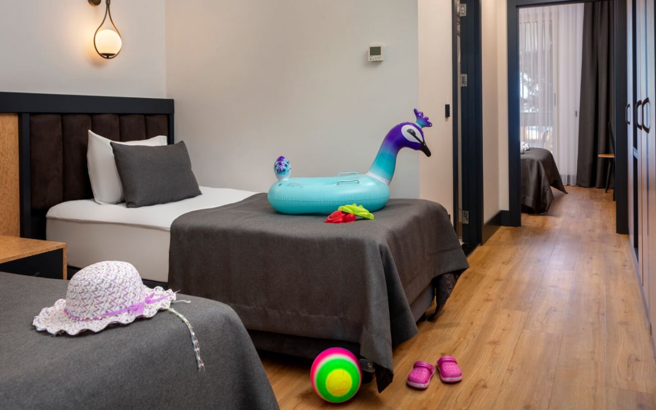 - Стаи тип CHILD FRIENDLY са с по-ниска цена за настаняване на 2-ма възрастни и 2 деца. Те са с по-малък размер от стандартните стаи, с крайно местоположение на територията на хотела, на приземен етаж, без балкон или тераса, с малка баня и различно обзавеждане.