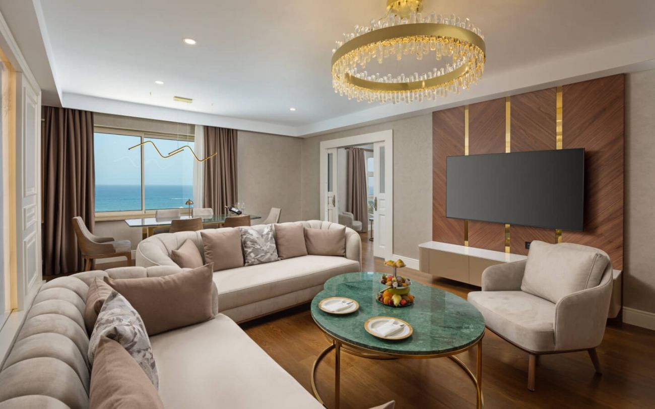 Хотелът разполага с общо 328 стаи, от които 262 стандартни стаи, 64 фамилни стаи и 2 кралски апартамента. Всички стаи са оборудвани с: централен климатик, сателитна телевизия, телефон, безжичен интернет, баня с вана, сешоар, мини бар – зарежда се ежедневно с вода, безалкохолни и бира, сейф, балкон. Почистване на стаите и смяна на кърпите – всеки ден, смяна на бельото – 3 пъти в седмицата.